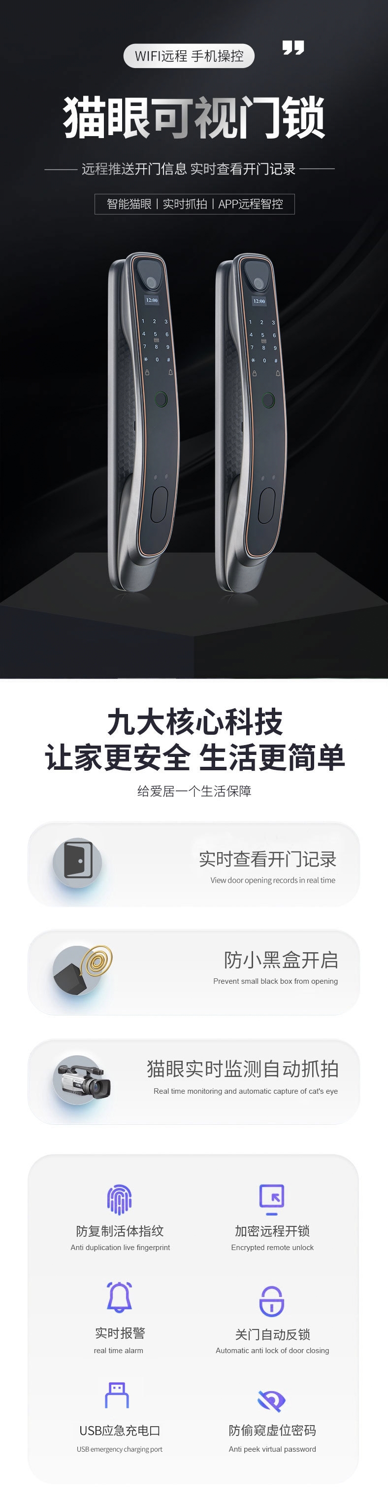 可配无线充电+手机视频通话 主动实时监控 3D人脸解锁 密码解锁 指纹解锁 磁卡解锁 钥匙解锁 手机解锁 临时密码 可视猫眼 可配置无线充电