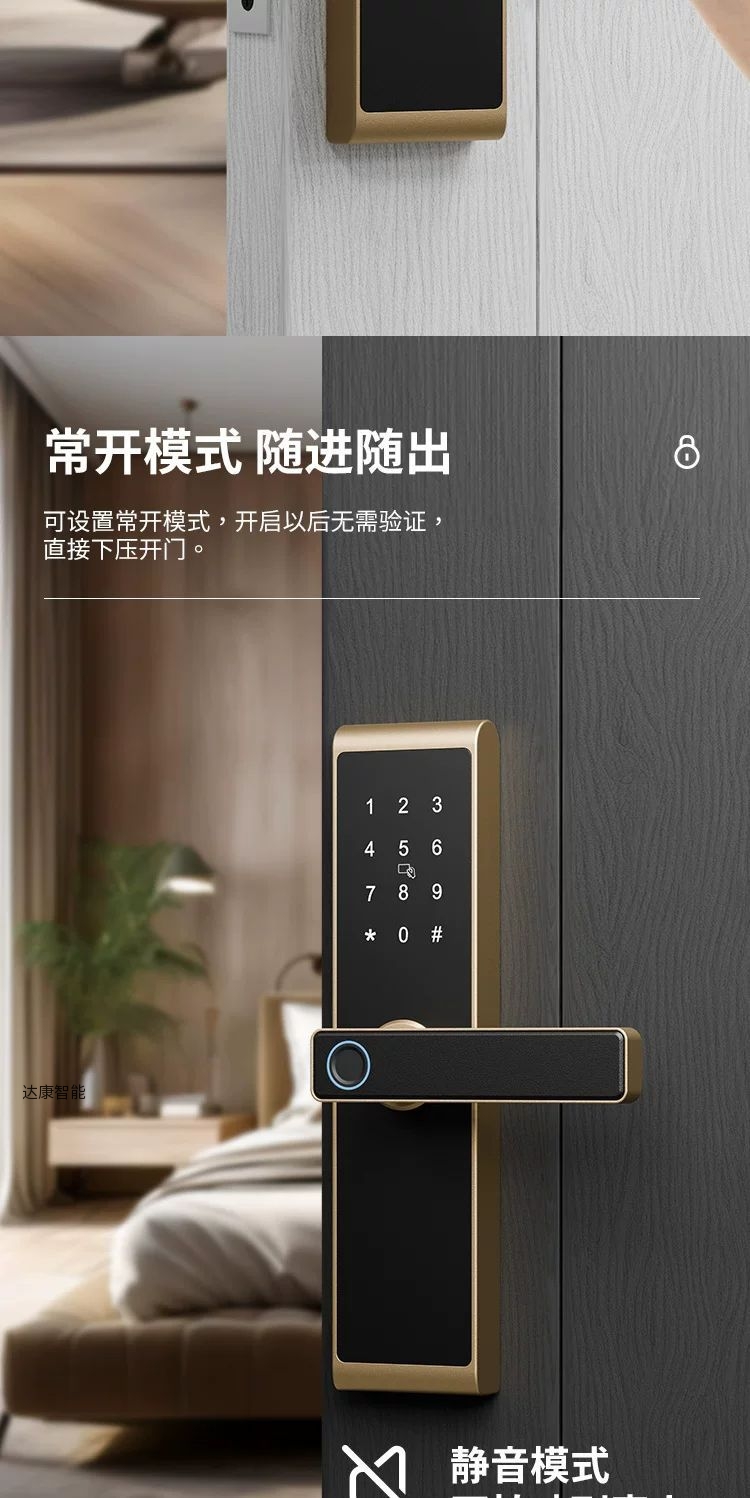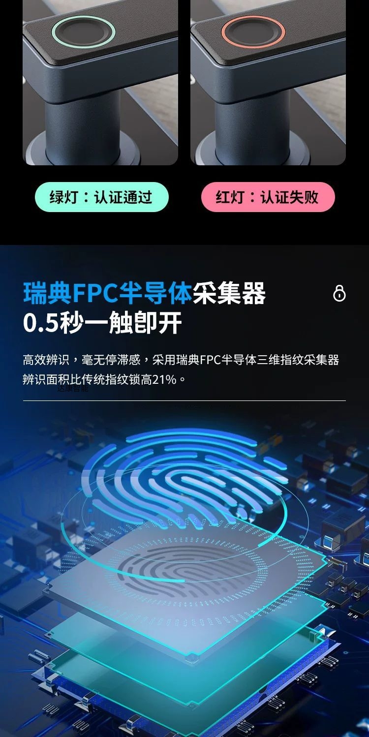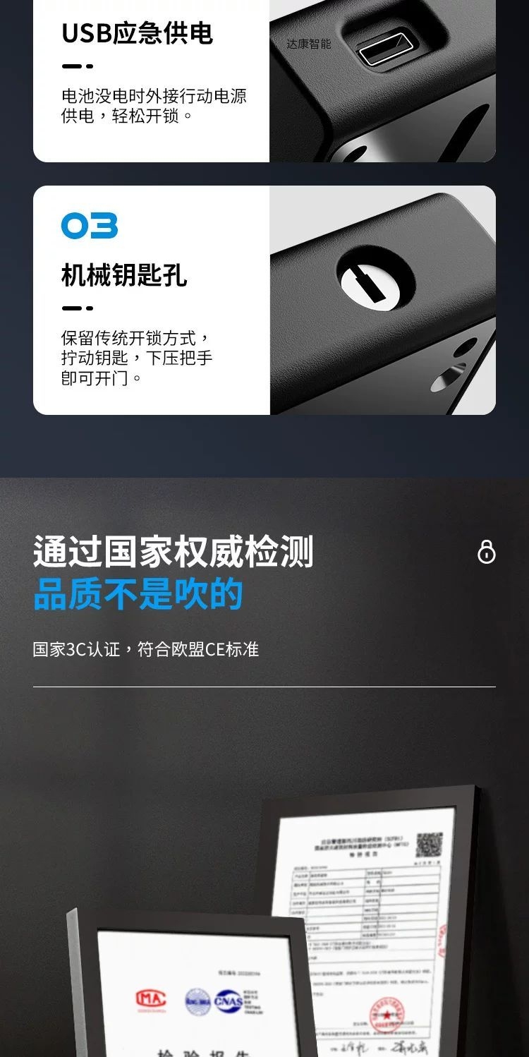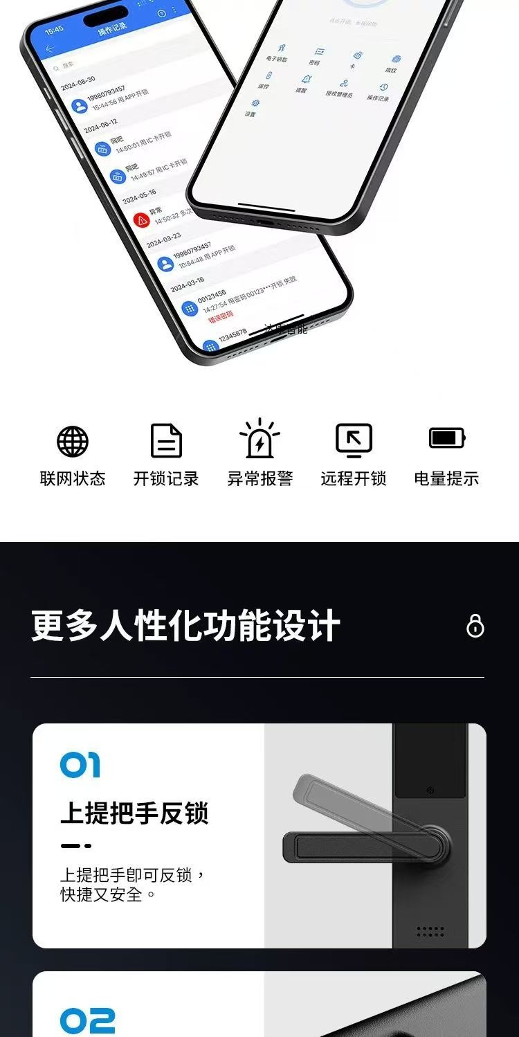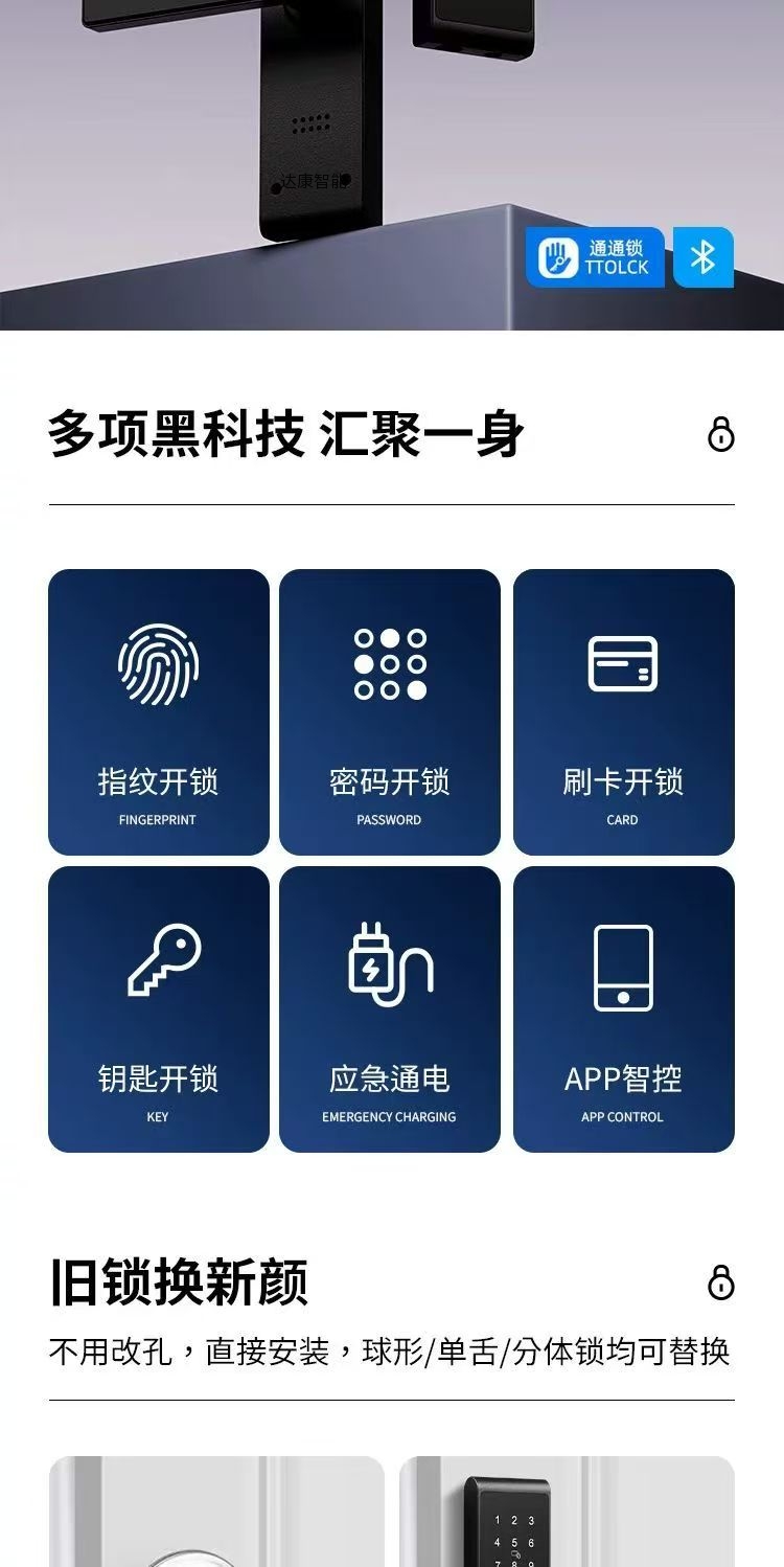 标配密码、刷卡、蓝牙开锁、备用钥匙功能,铝合金材质