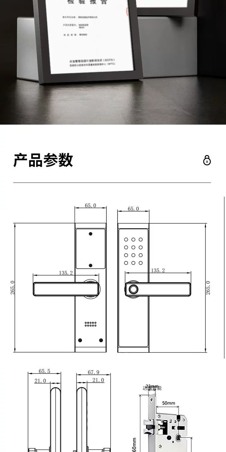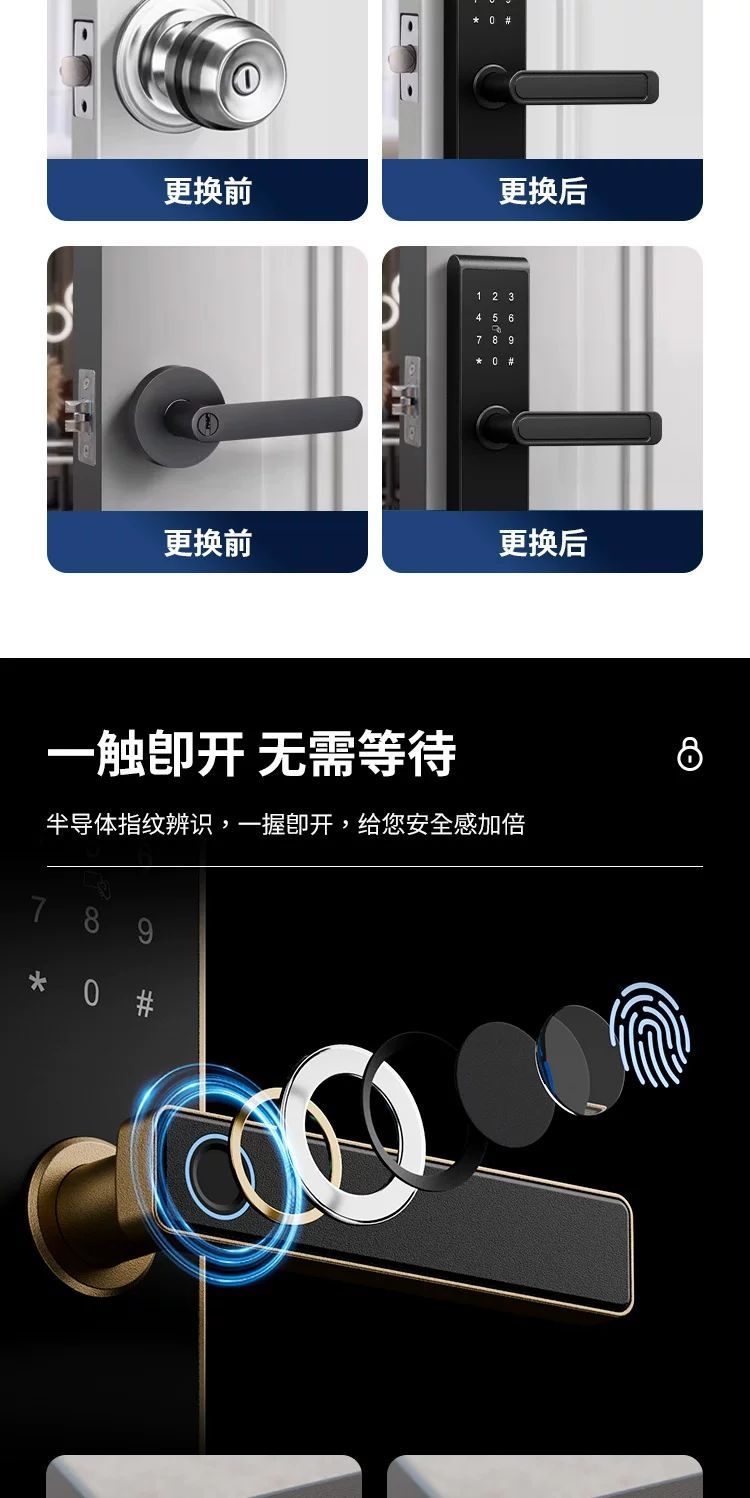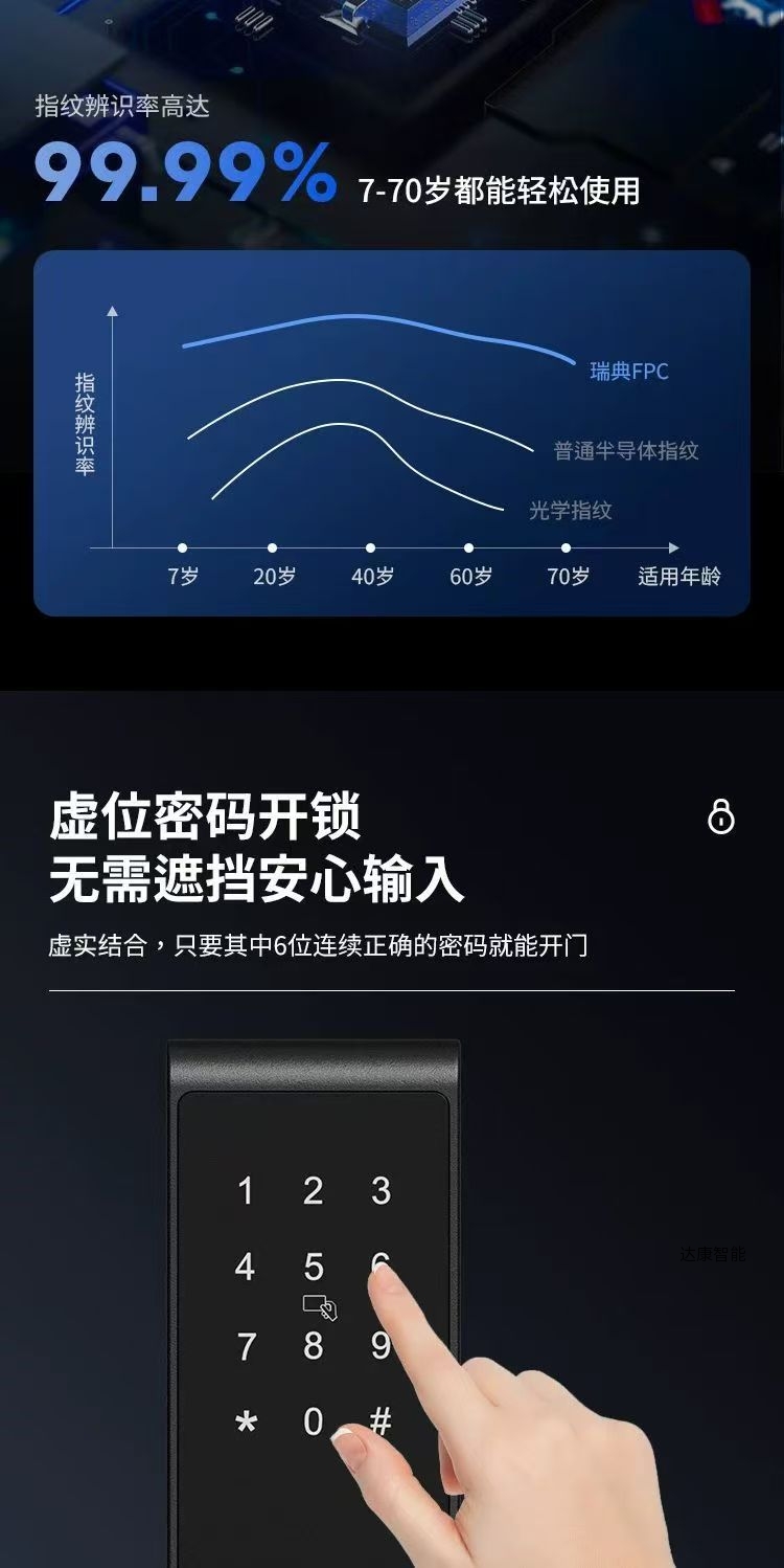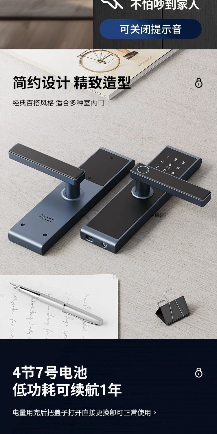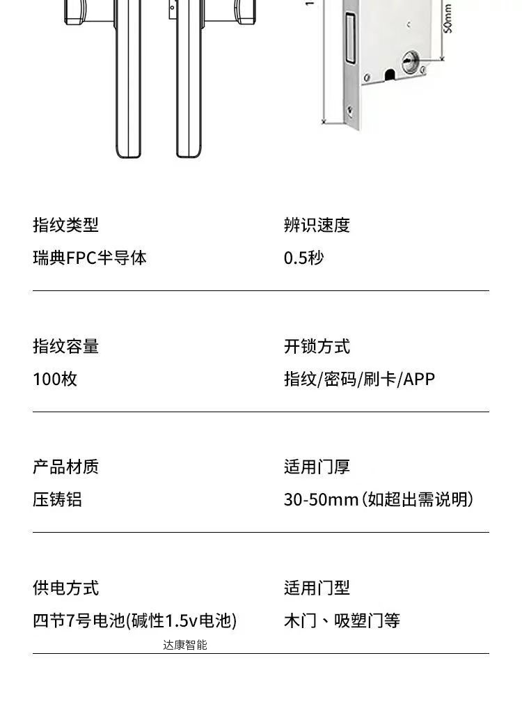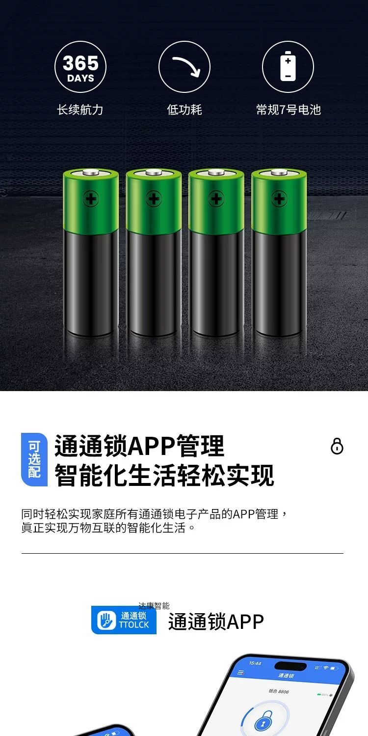 标配密码、刷卡、蓝牙开锁、备用钥匙功能,铝合金材质