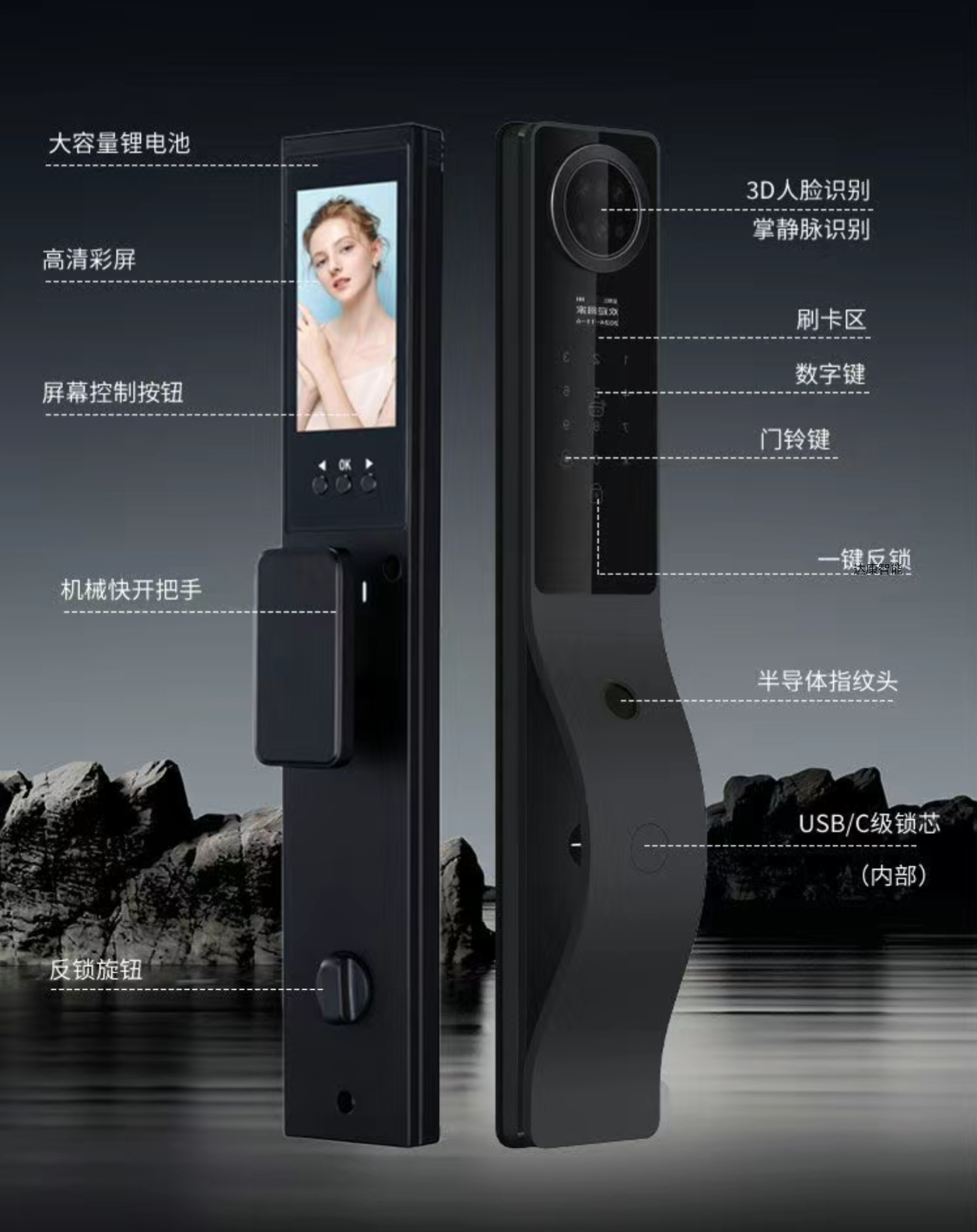 人脸识别 密码、刷卡、蓝牙开锁、备用钥匙功能,主动视频对讲,远程开锁,